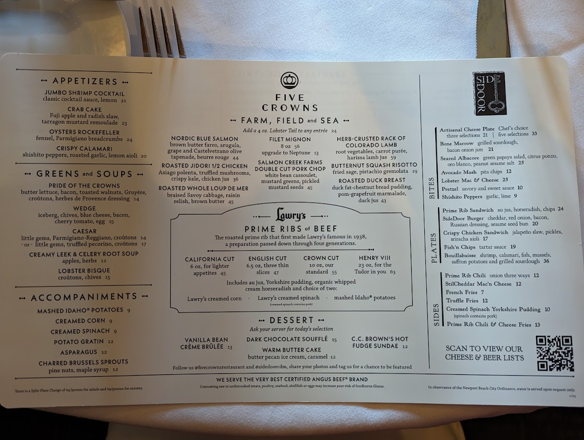 Nestled in the charming setting of Corona Del Mar, Five Crowns offers an exquisite dining experience that pays homage to its rich heritage. Famous for its legendary prime rib, the restaurant serves a meticulous selection of dishes, expertly crafted and presented. The Crown Cut prime rib, a 10 oz delight, is served with au jus, Yorkshire pudding, and decadent sides, while the grand Henry VIII cut extends the royal treatment for the hearty eater.